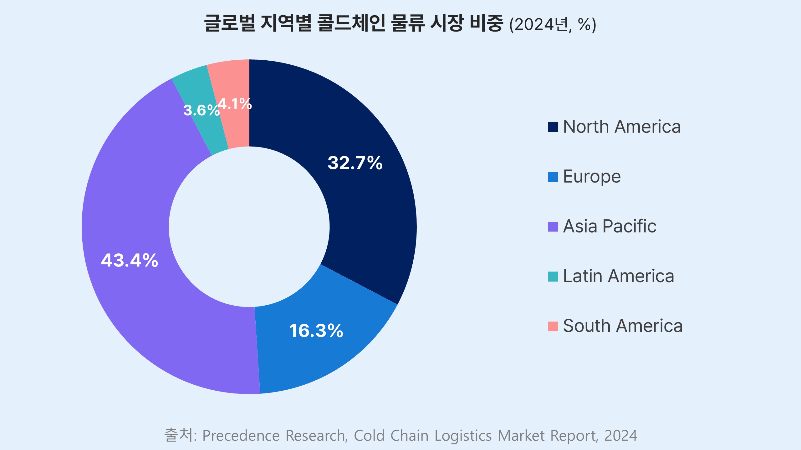 아시아·태평양 지역(APAC)은 전 세계 콜드체인 물류 시장의 43.4%를 차지하며, 📈가장 빠른 성장세를 보이고 있습니다. |