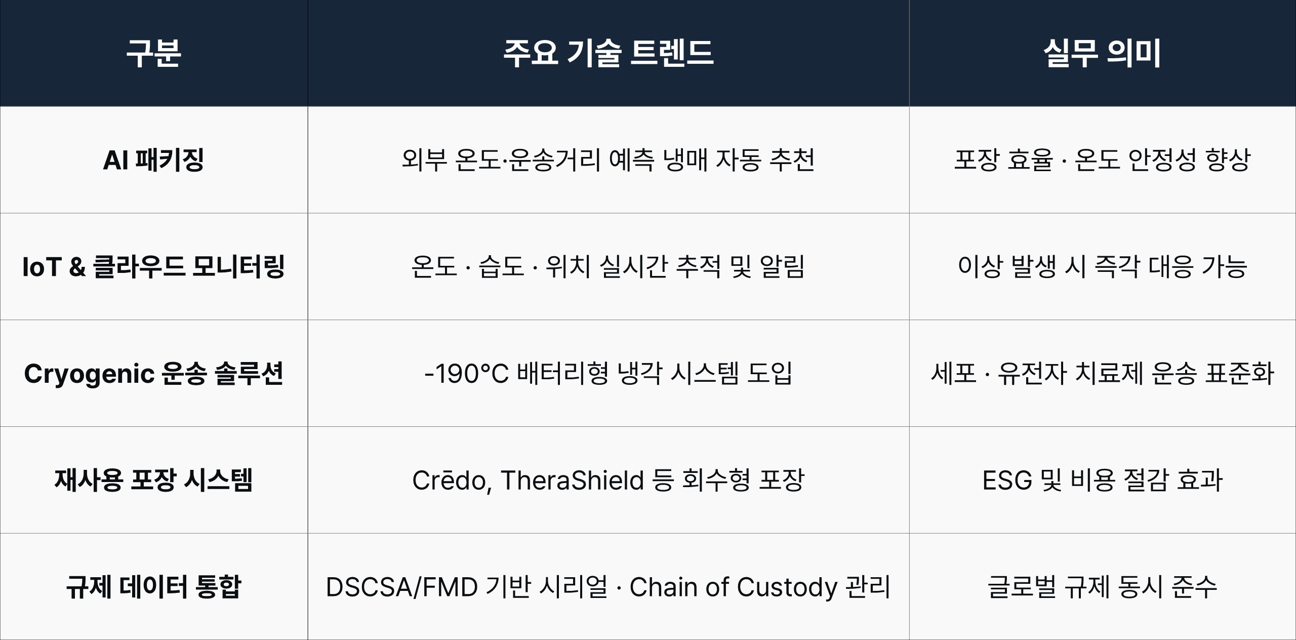 🔍 실무 인사이트 – 국내 운영자가 주목해야 할 3가지 포인트 국내 콜드체인 운영은 이제 ‘속도 중심’에서 ‘품질과 신뢰 중심’으로 전환이 필요합니다. |