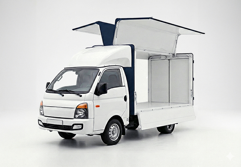 - 적재함 옆면이 날개처럼 위로 통째로 열리는 형태